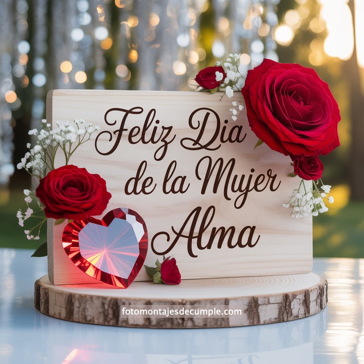 En esta colección de imágenes con nombre para el Día de la Mujer, el rojo vuelve a ser el gran protagonista. Este color intenso y apasionado simboliza el cariño, la determinación y la energía que caracteriza a tantas mujeres admirables. La base de madera natural aporta un estilo cálido y elegante, donde la frase “Feliz Día de la Mujer” se luce con una tipografía delicada y armoniosa. Justo debajo, el nombre personalizado aparece grabado con un acabado que simula estar tallado en la madera, creando un efecto visual auténtico y muy especial.