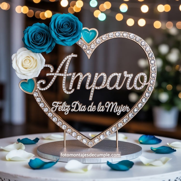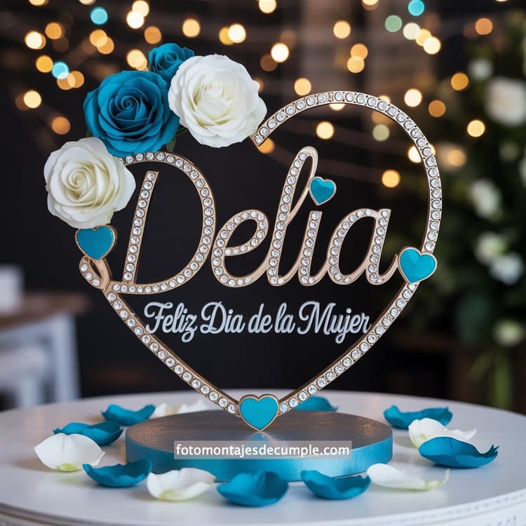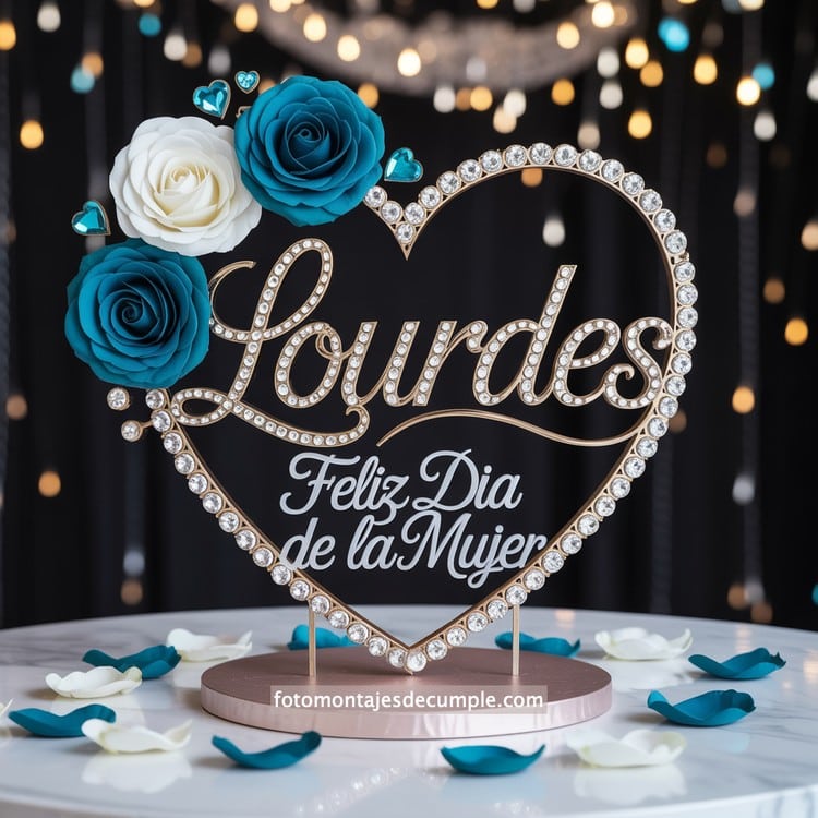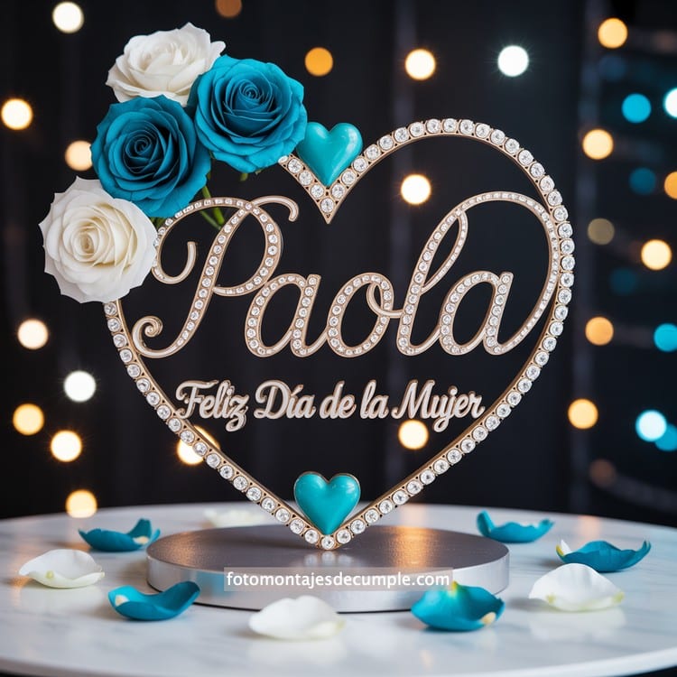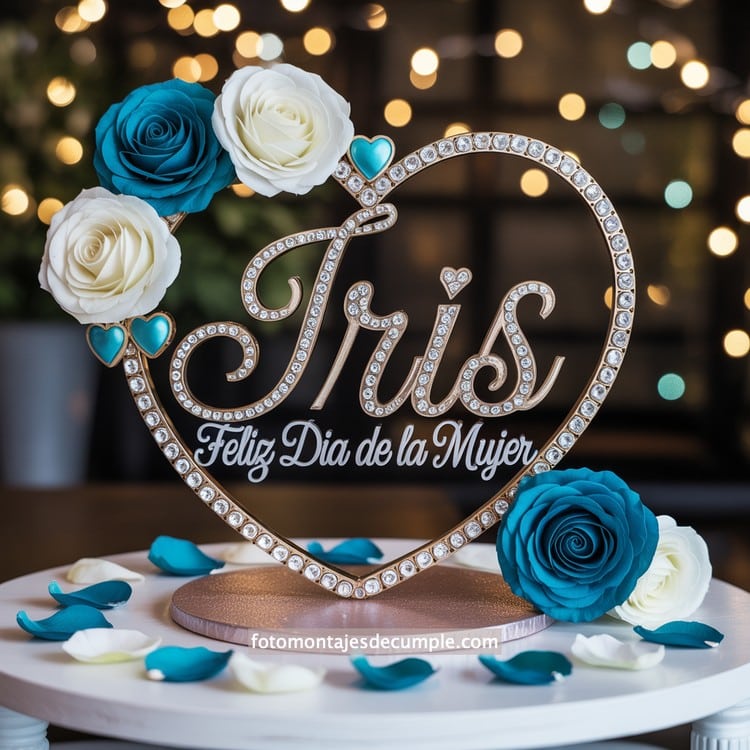 Sobre la tarjeta puede leerse el mensaje “Feliz Día de la Mujer”, acompañado de sutiles destellos de luz que iluminan toda la escena. Las flores en tonos turquesa y blanco coronan el diseño, aportando suavidad y un aire romántico que hace que cada imagen sea un pequeño homenaje visual. Todo el conjunto transmite elegancia y ternura, ideal para dedicar a esa mujer especial que ilumina tu vida.
