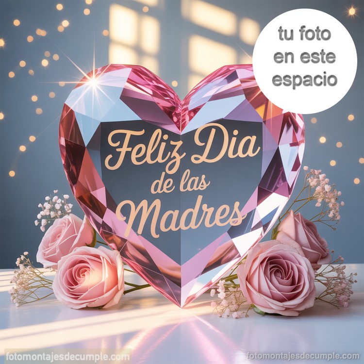 El diseño presenta un corazón con efecto cristal facetado que refleja la luz y genera un acabado brillante y llamativo. En su interior se destaca la frase “Feliz Día de las Madres”, integrada de manera equilibrada y con una tipografía delicada. Alrededor del elemento principal se incorporan flores suaves que aportan un toque natural y cálido, mientras que el fondo con luces difuminadas crea una atmósfera emotiva y agradable. Además, cuenta con un espacio definido donde puedes insertar tu fotografía, facilitando la creación de un fotomontaje prolijo y visualmente atractivo.