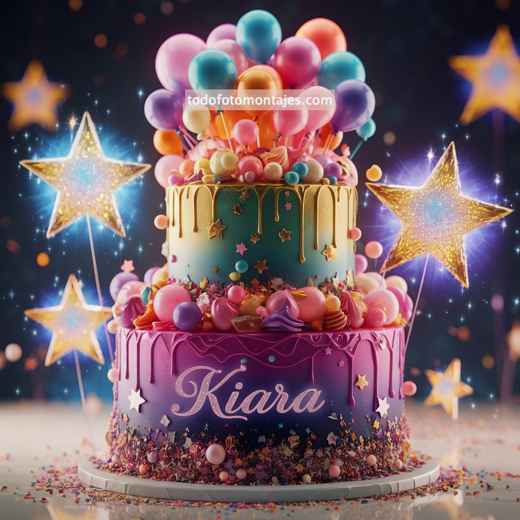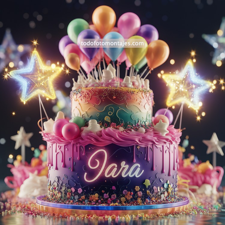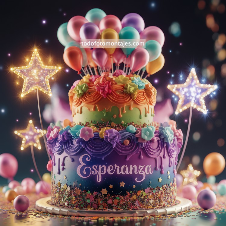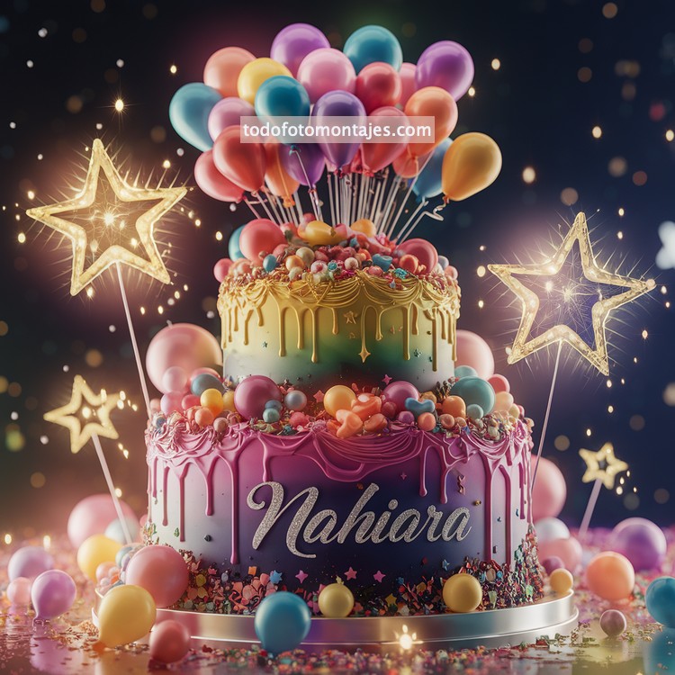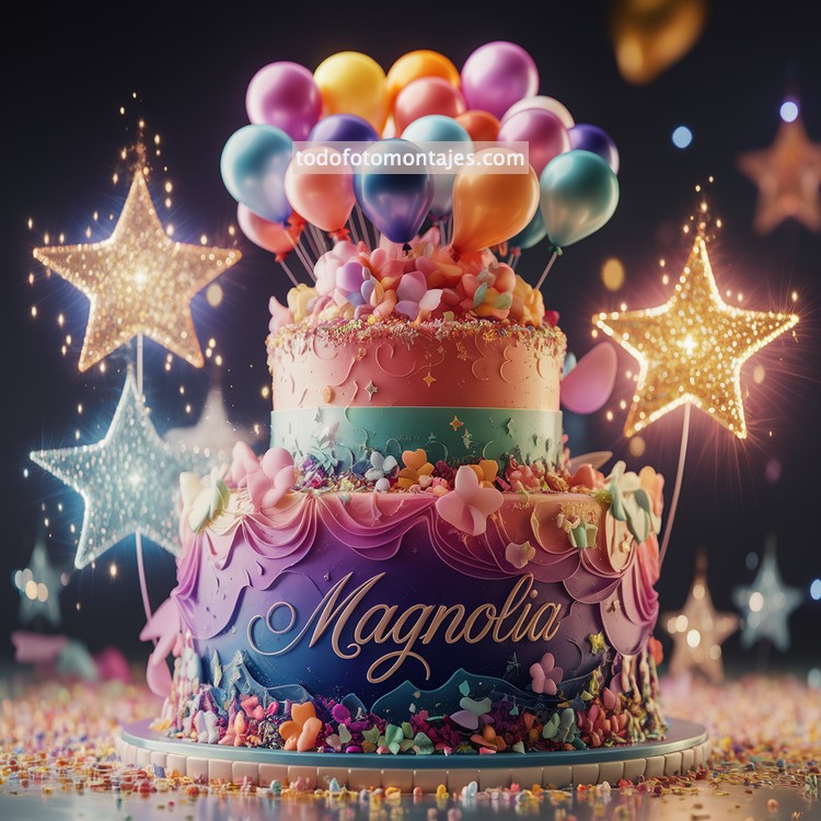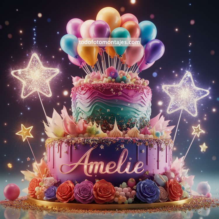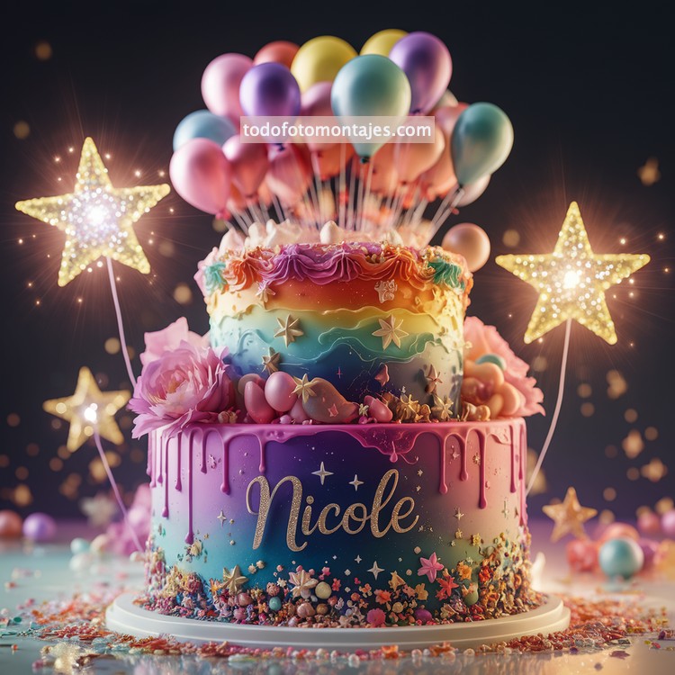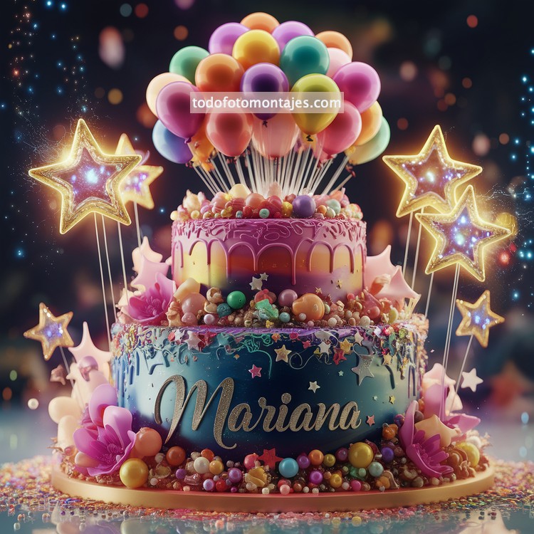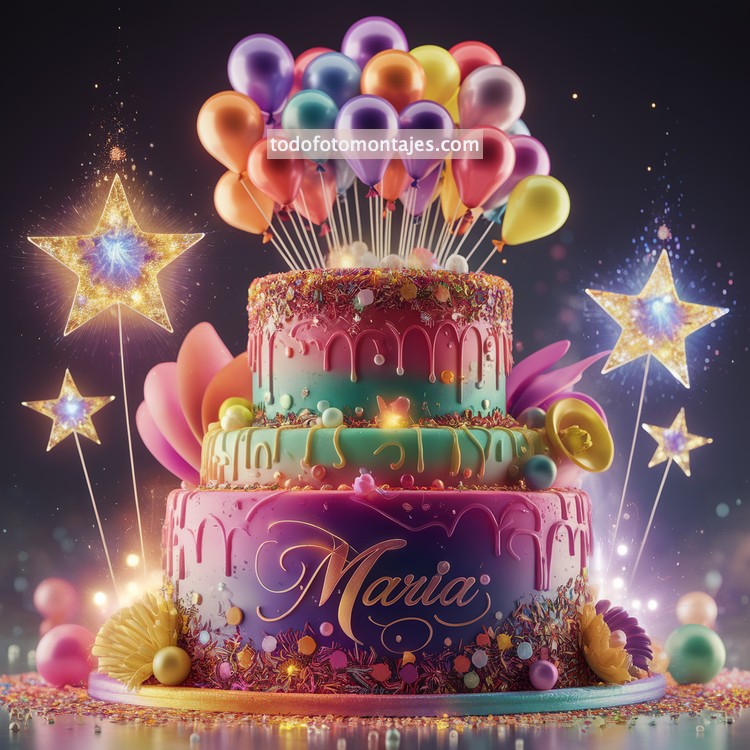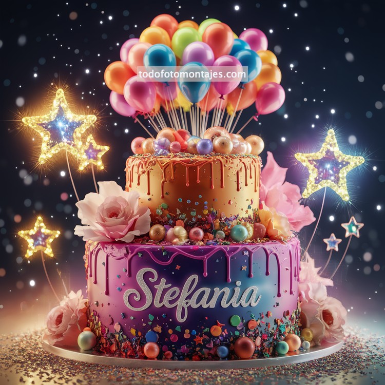 Celebrar un cumpleaños siempre es un momento especial, y qué mejor manera de hacerlo que con una hermosa imagen personalizada con nombres de feliz cumpleaños para mujer. En este diseño, el gran protagonista es un pastel decorado con estrellas y flores, creando un ambiente lleno de color y dulzura.