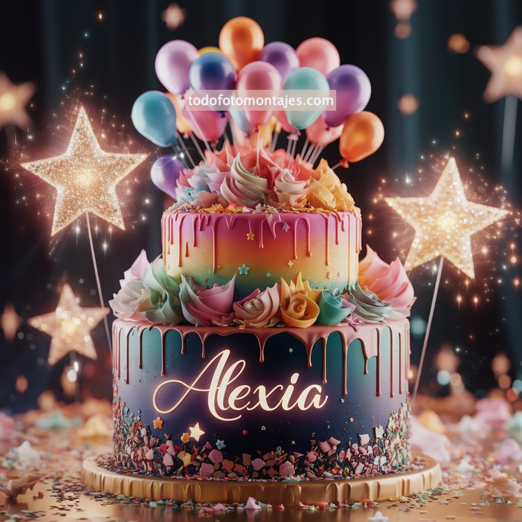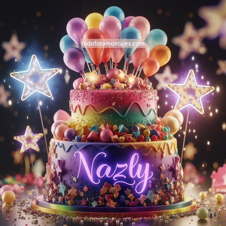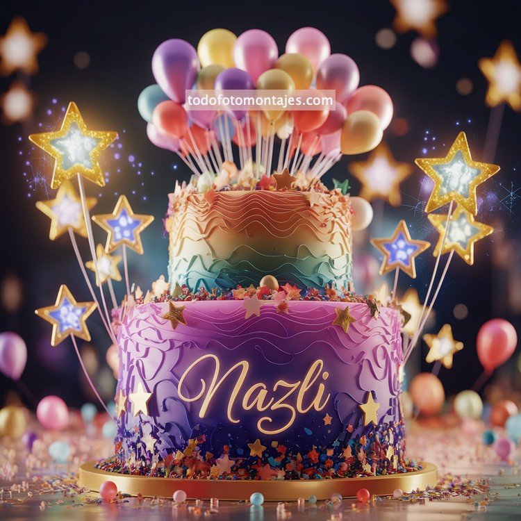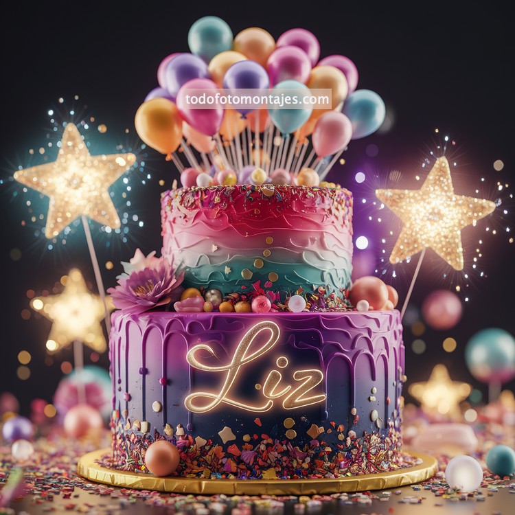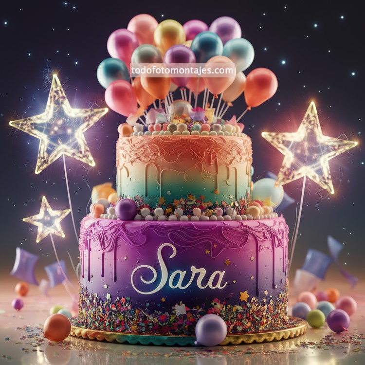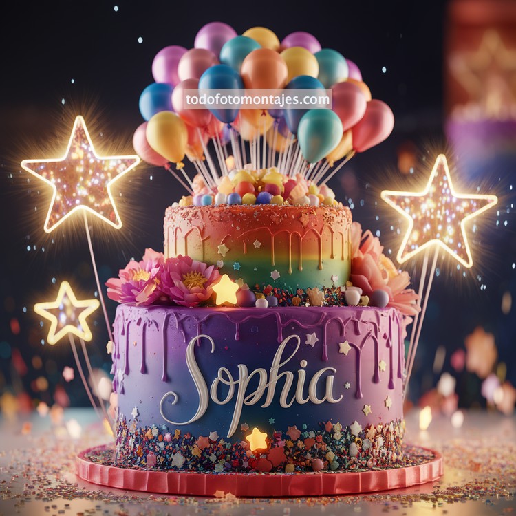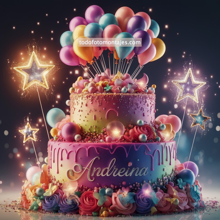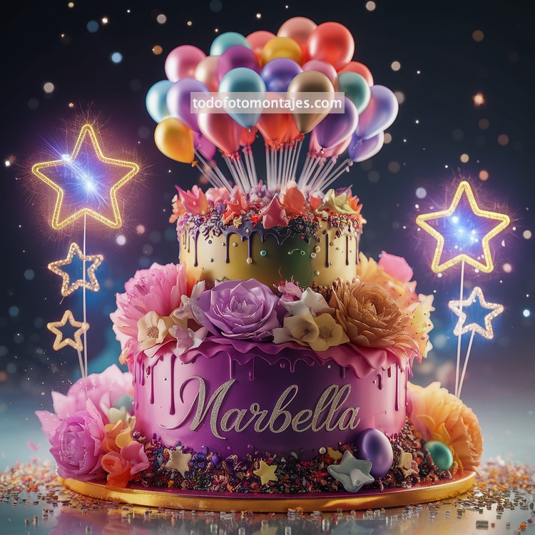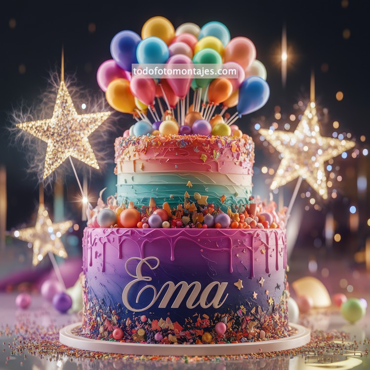 Celebrar un cumpleaños siempre es un momento especial, y qué mejor manera de hacerlo que con una hermosa imagen personalizada con nombres de feliz cumpleaños para mujer. En este diseño, el gran protagonista es un pastel decorado con estrellas y flores, creando un ambiente lleno de color y dulzura.