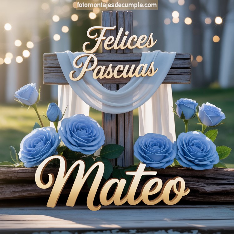 El diseño que identifica a esta serie tiene una profundidad visual que se nota desde el primer segundo. Una cruz de madera rústica domina el centro de la imagen, con una tela blanca que cae sobre ella como símbolo de paz y espiritualidad. El nombre de cada hombre aparece en grandes letras doradas con relieve, apoyadas sobre una mesa de madera clara que le da solidez y presencia a la composición. Rosas azules naturales rodean la base de la cruz en ambos lados, aportando color y frescura sin restarle seriedad al conjunto. La frase "Felices Pascuas" en cursiva dorada corona la parte superior con una tipografía que equilibra calidez y distinción. El exterior desenfocado, con vegetación y destellos de luz entre los árboles, convierte cada imagen en una escena completa, casi cinematográfica.