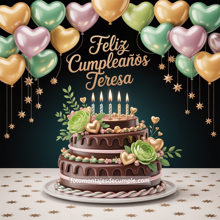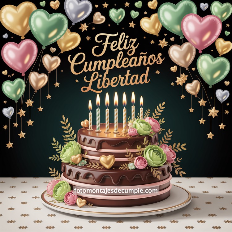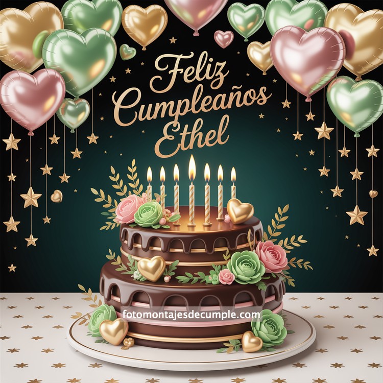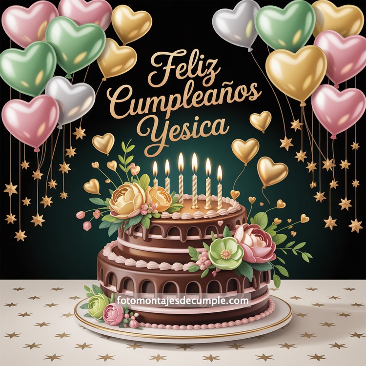 La imagen central muestra un pastel de dos pisos cubierto de chocolate, decorado con delicadas flores en tonos pasteles que aportan frescura y armonía. Las velas coronan la torta, representando deseos y esperanzas que se renuevan con cada año que pasa. Acompañando este detalle, se encuentran globos en forma de corazón en muchos colores como: verde, dorado, rosado, etc, que flotan suavemente en el fondo, transmitiendo una sensación de calidez y celebración. Las estrellas doradas que completan la composición le dan un toque mágico, como si se tratara de un cielo festivo y lleno de luz.