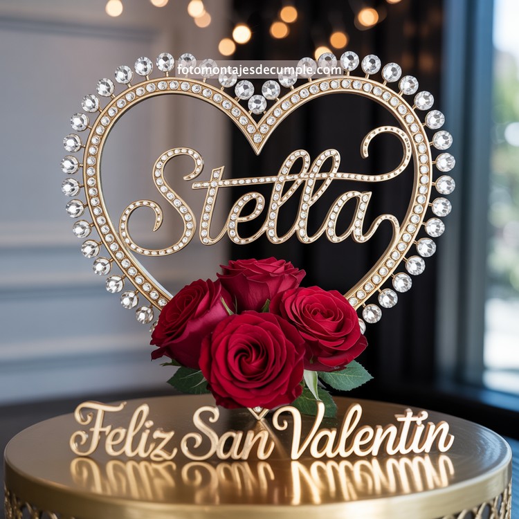El diseño destaca por su estilo delicado y femenino. En el centro se luce un hermoso corazón elaborado con brillantes tipo diamante, que aporta luz y sofisticación a la imagen. Dentro del corazón aparece el nombre de mujer, cuidadosamente integrado con una tipografía elegante y luminosa, pensada para resaltar la belleza del nombre y hacerlo protagonista del mensaje. En la parte inferior, un conjunto de rosas rojas intensas aporta profundidad emocional, simbolizando amor verdadero, pasión y dulzura.