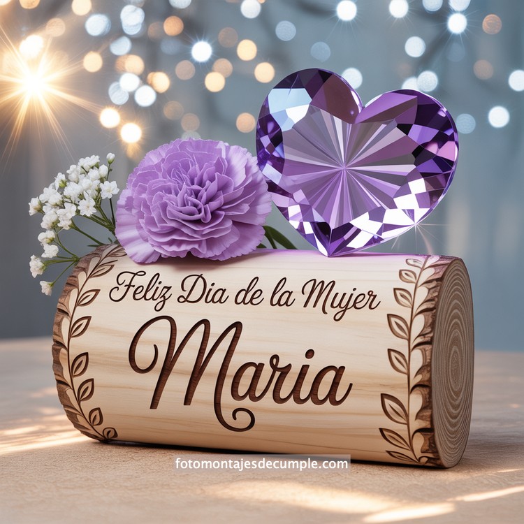 El protagonista del diseño es un hermoso corazón de cristal lila, tallado con múltiples facetas que reflejan la luz de manera brillante y elegante. A su lado, un precioso clavel violeta aporta un toque floral romántico y femenino, símbolo de cariño y fortaleza. Todo descansa sobre una base de madera clara, grabada con la frase “Feliz Día de la Mujer” junto al nombre personalizado, formando una composición equilibrada, dulce y muy especial.