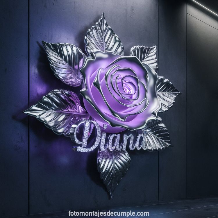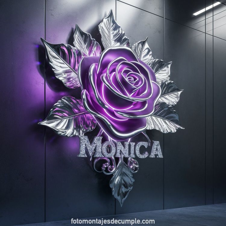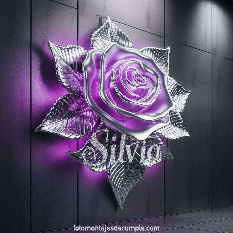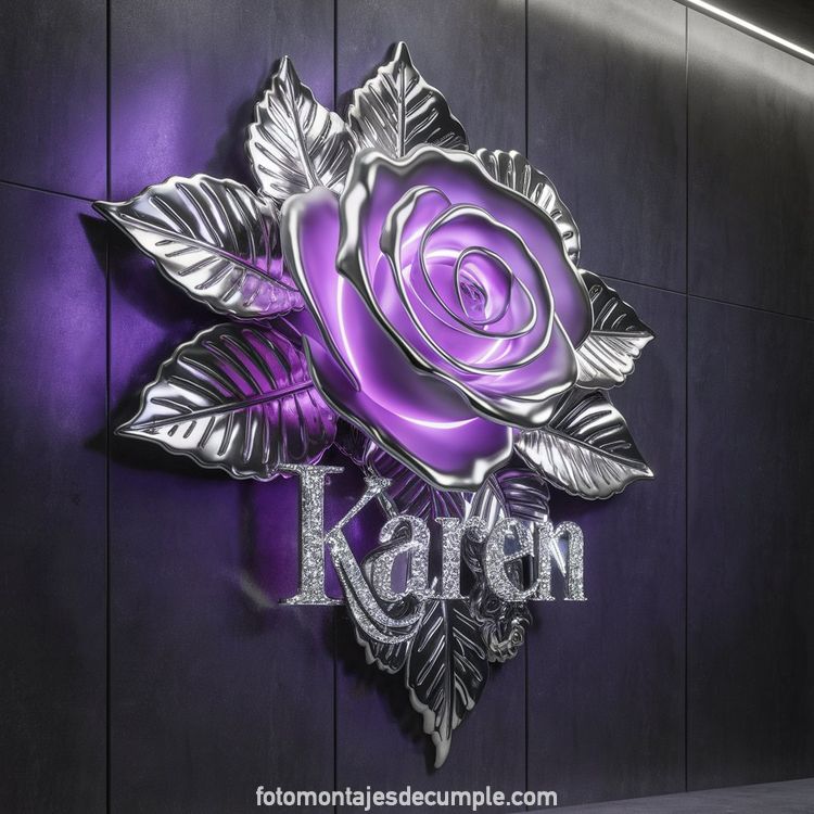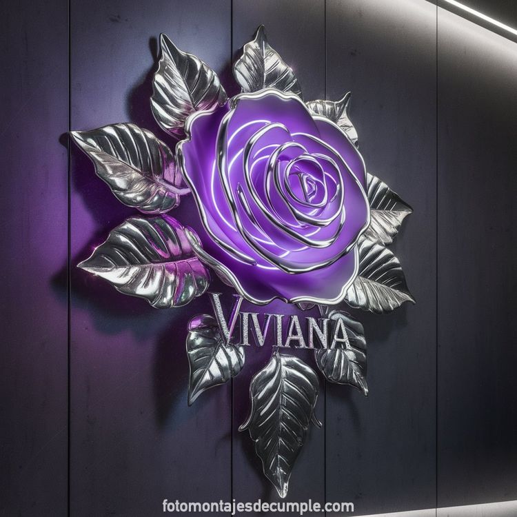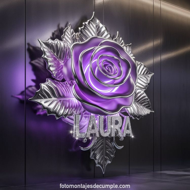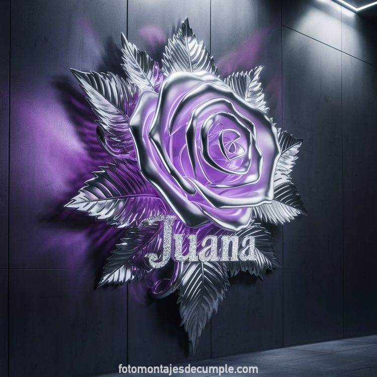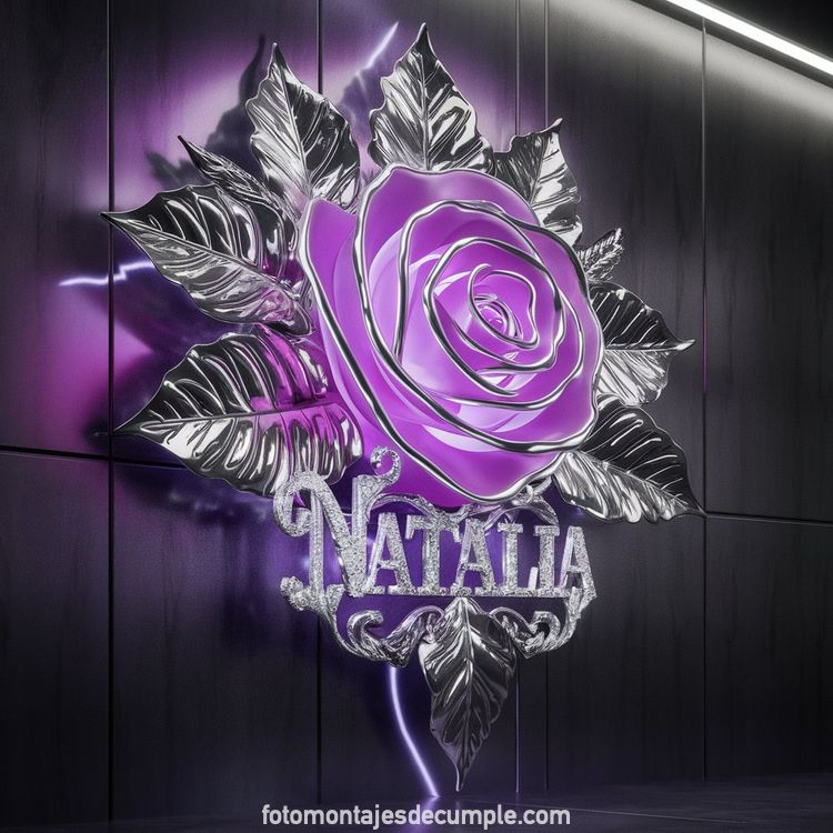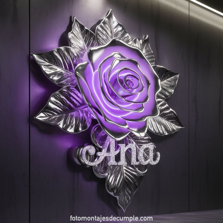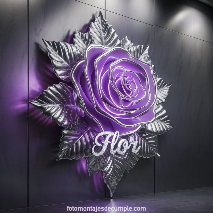 Seguimos sumando más diseños de imágenes con nombres de mujer personalizados. Y en esta oportunidad queremos compartirles este nuevo modelo con un diseño elegante y sofisticado. Tiene una rosa en 3g muy grande en color violeta luminoso con plateado sobre la pared. Debajo de la rosa está escrito el nombre en letra color plateado con brillos.