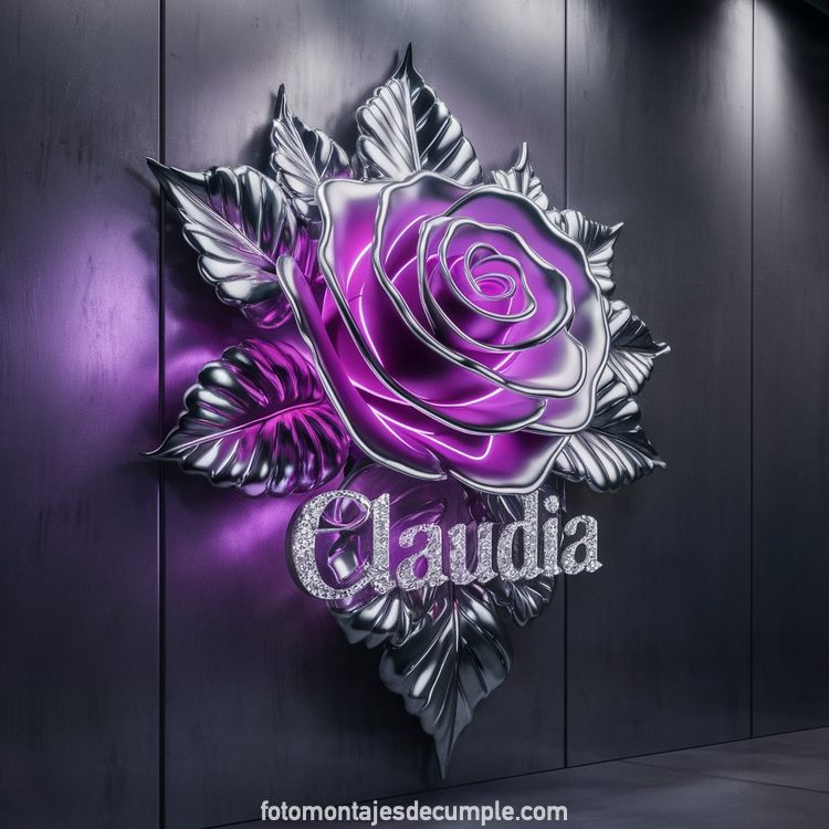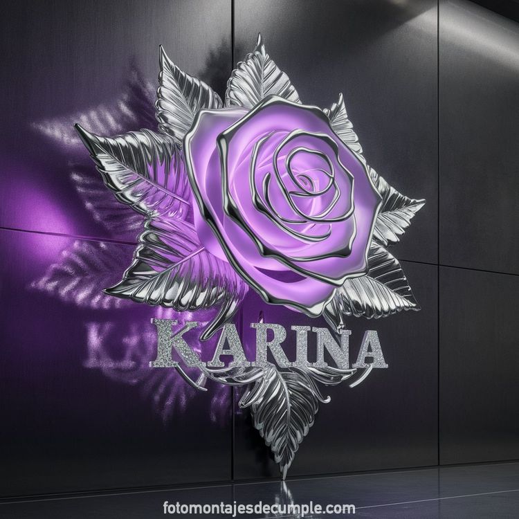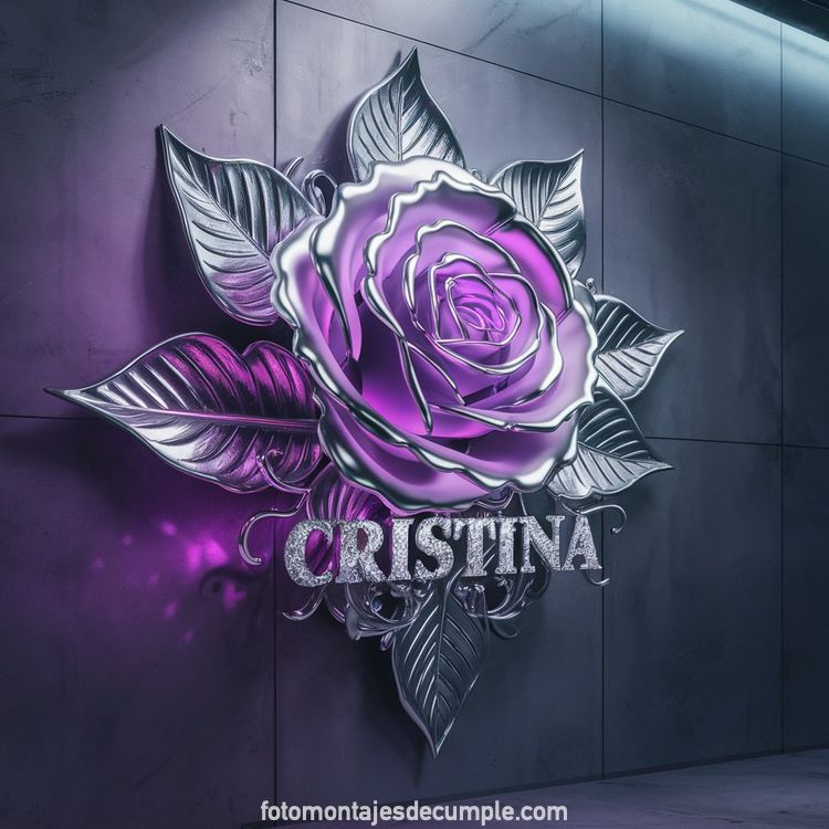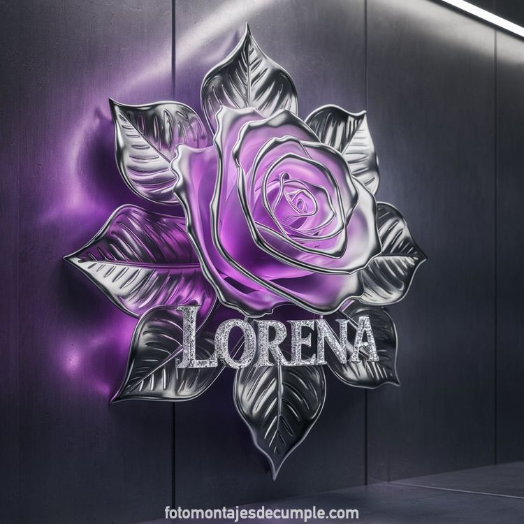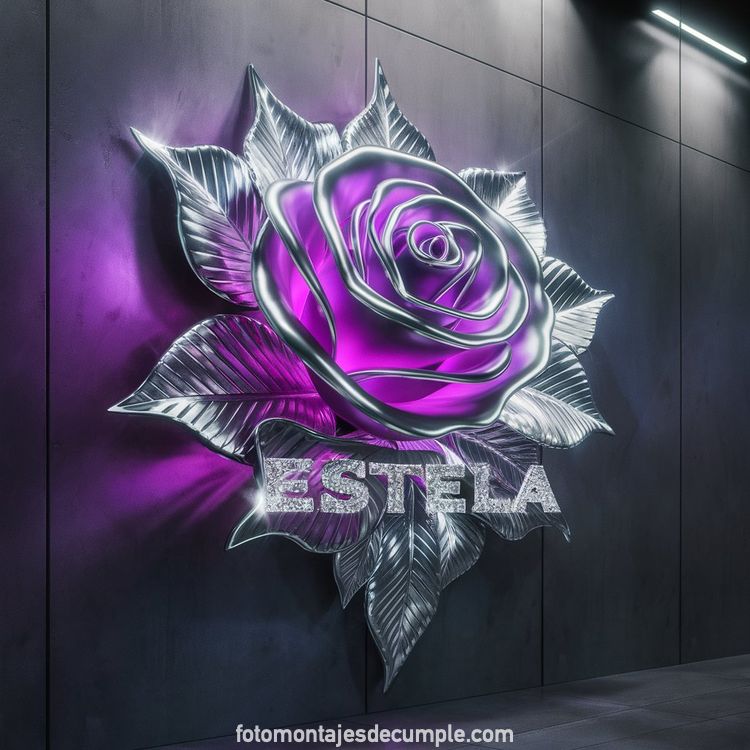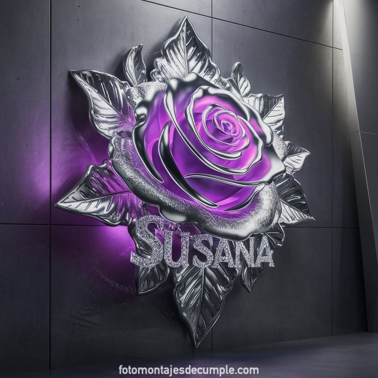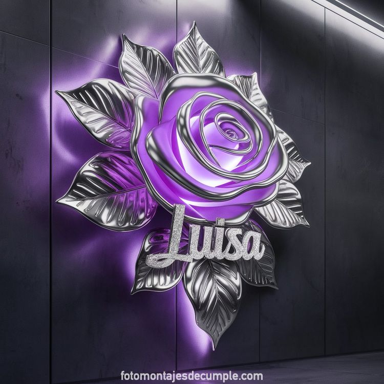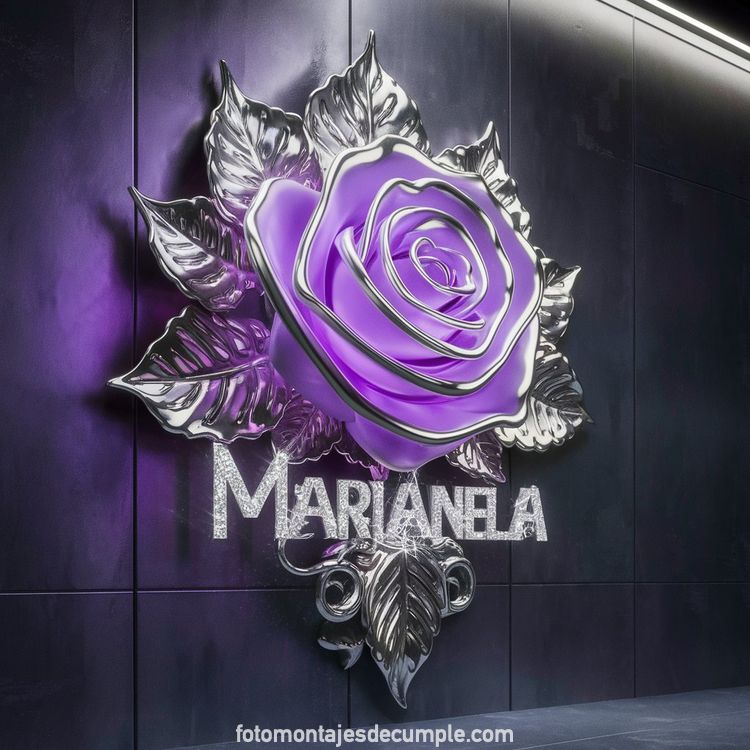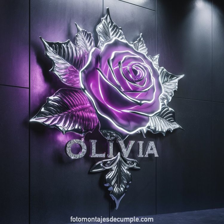 Seguimos sumando más diseños de imágenes con nombres de mujer personalizados. Y en esta oportunidad queremos compartirles este nuevo modelo con un diseño elegante y sofisticado. Tiene una rosa en 3g muy grande en color violeta luminoso con plateado sobre la pared. Debajo de la rosa está escrito el nombre en letra color plateado con brillos.