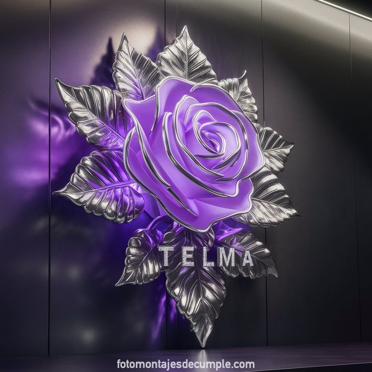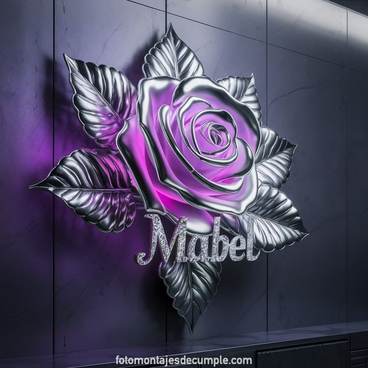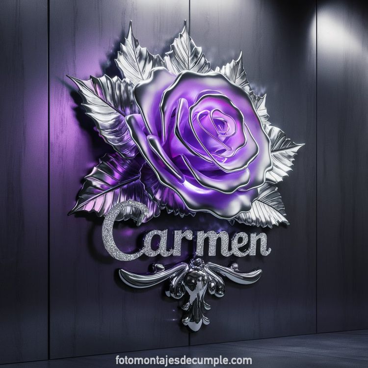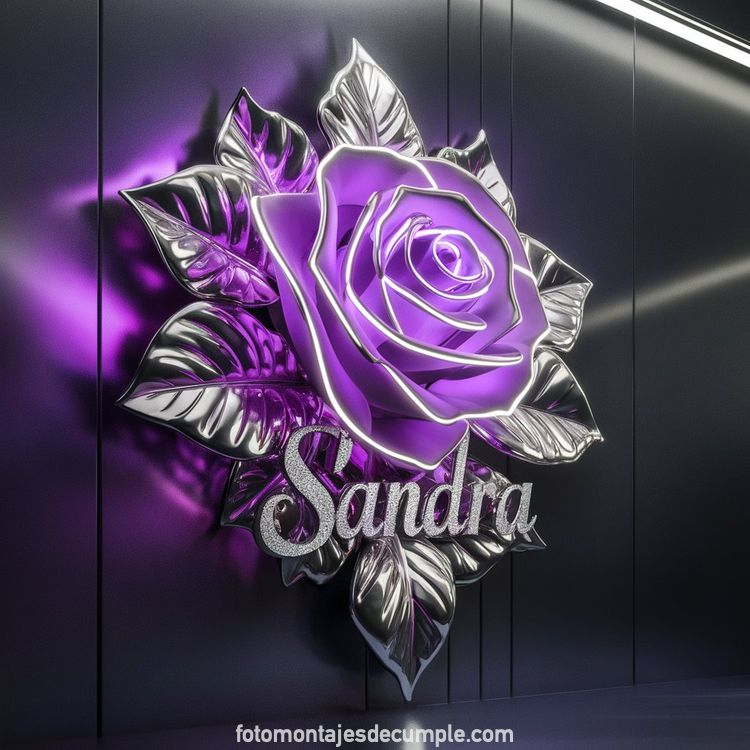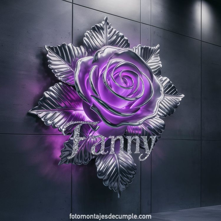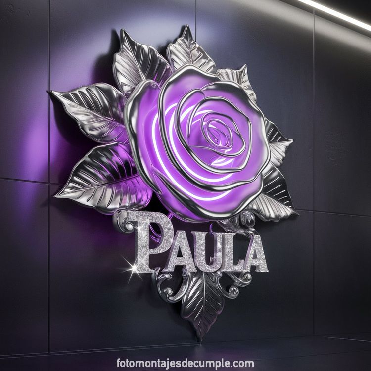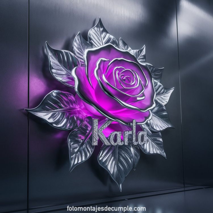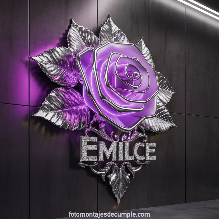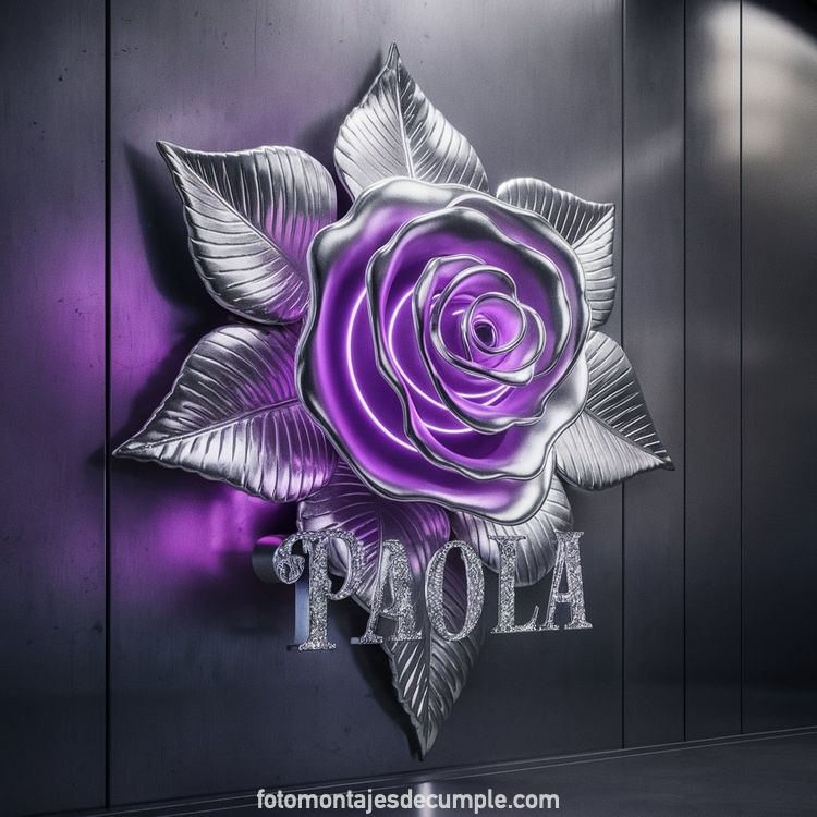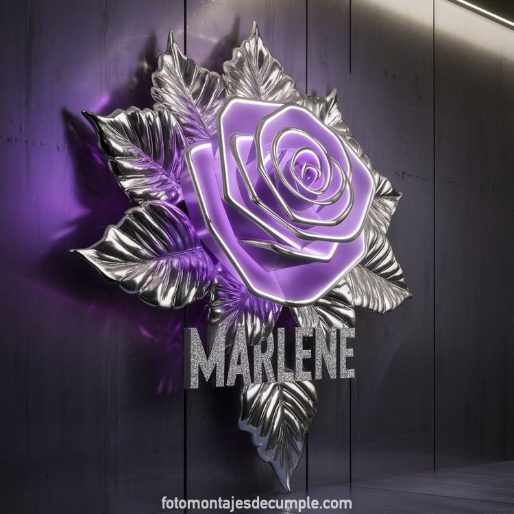Seguimos sumando más diseños de imágenes con nombres de mujer personalizados. Y en esta oportunidad queremos compartirles este nuevo modelo con un diseño elegante y sofisticado. Tiene una rosa en 3g muy grande en color violeta luminoso con plateado sobre la pared. Debajo de la rosa está escrito el nombre en letra color plateado con brillos.