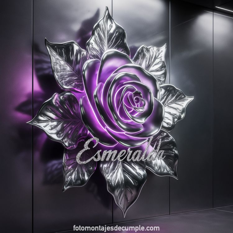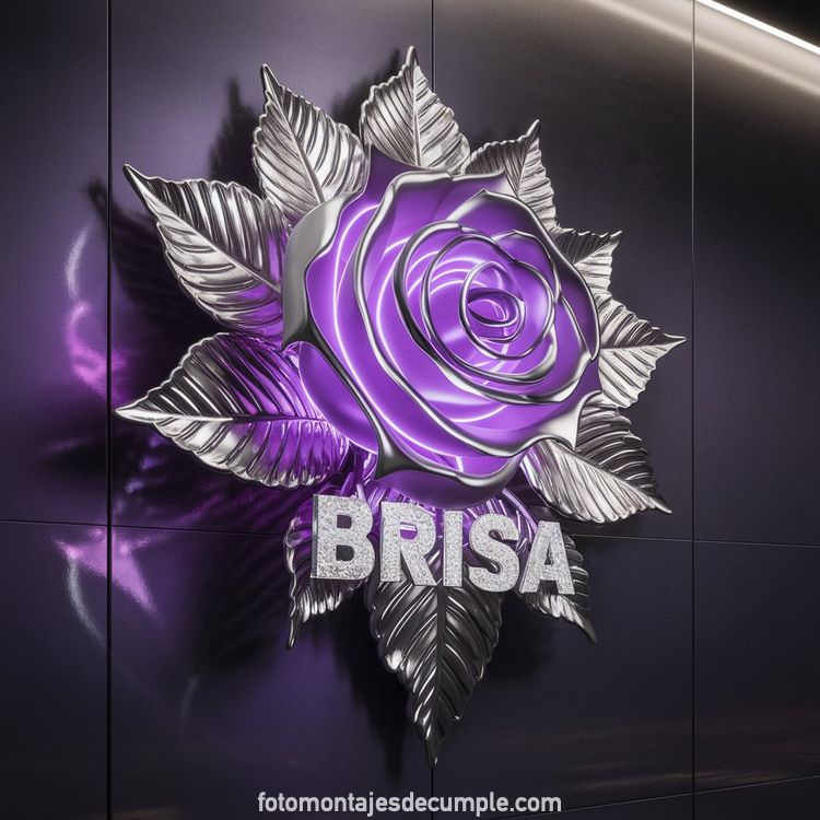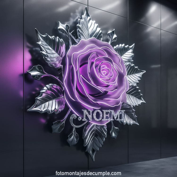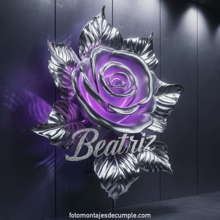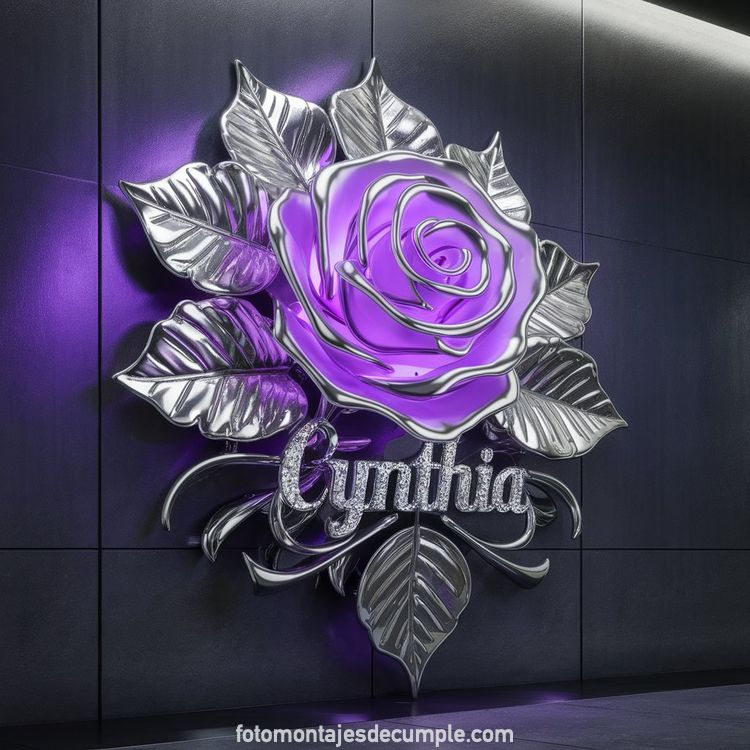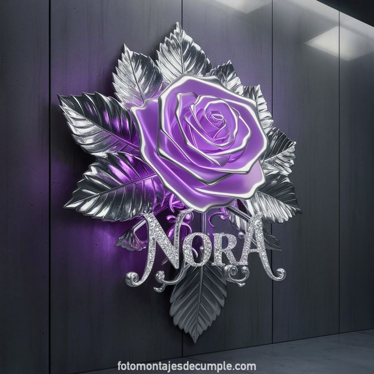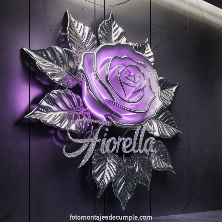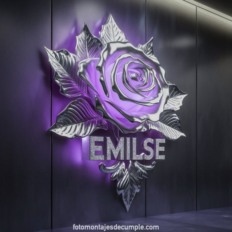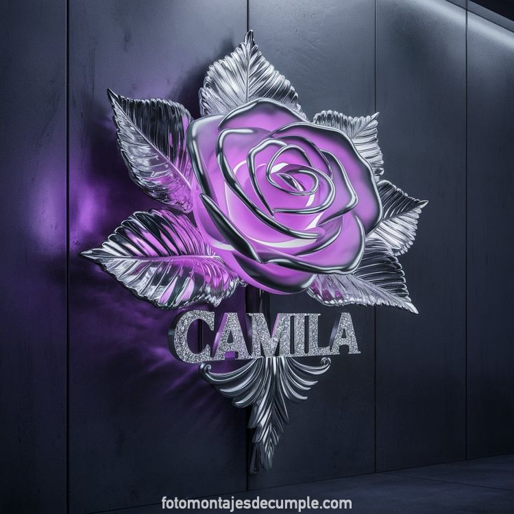 Seguimos sumando más diseños de imágenes con nombres de mujer personalizados. Y en esta oportunidad queremos compartirles este nuevo modelo con un diseño elegante y sofisticado. Tiene una rosa en 3g muy grande en color violeta luminoso con plateado sobre la pared. Debajo de la rosa está escrito el nombre en letra color plateado con brillos.