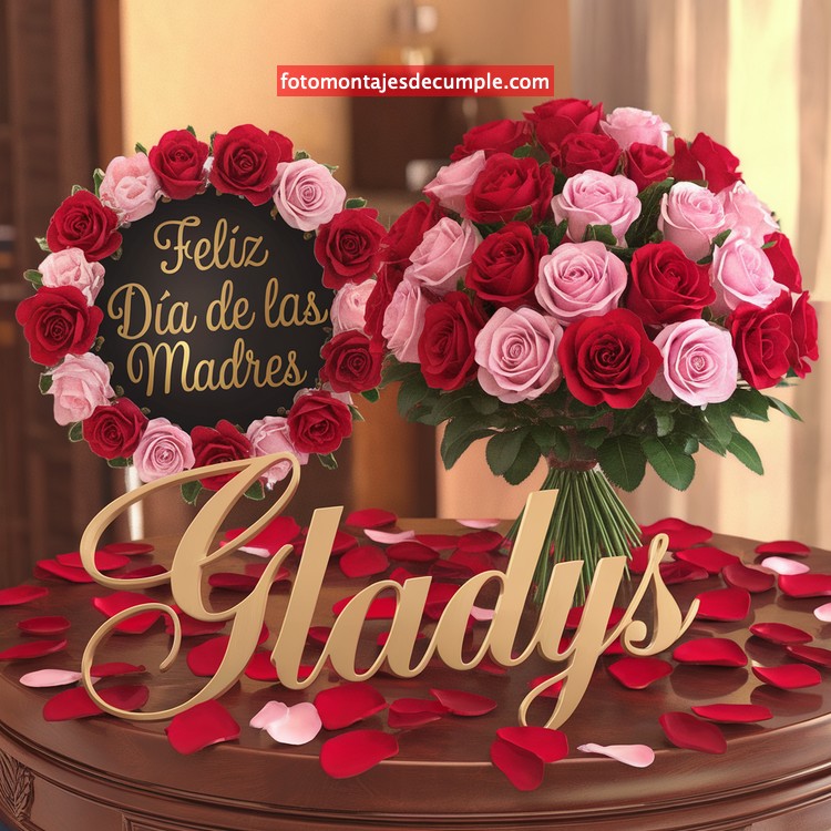 El diseño central de estas imágenes presenta un ramo de rosas rojas y rosadas, símbolo eterno del amor y la ternura. A un costado, un elegante cartel con la frase “Día de las Madres” añade un toque delicado y festivo. Y como detalle protagonista, en la parte inferior de la imagen, se encuentra el nombre personalizado de cada mamá, escrito en una hermosa letra dorada, grande y en cursiva, que resalta con elegancia y calidez sobre el fondo.